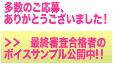 最終審査は投票でしたので結果自体は短時間に出たのですが、本当に僅差で、どの方に決まってもおかしくない素晴らしい内容のものでした。結果としてhp上にアップされたボイスサンプルの内容よりも、さらに洗練されたより良いパフォーマンスを見せてくれた方々に受賞が決まったのではないかと思っております。残念ながら今回のオーディションで落選となった方々には、この経験を力に変えて強い気持ちを持ってこれからも頑張って下さいとエールをお送りします。